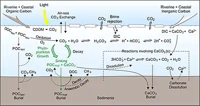 - 1 2 3 4 Moran, M; Kujawinski, E; Stubbins, A; Fatland, R; Aluwihare, L; Buchan, A; Crump, B; Dorrestein, P; Dyhrman, S; Hess, N; Howe, B; Longnecker, K; Medeiros, P; Niggemann, J; Obernosterer, I; Repeta, D; Waldbauer, J (2016). "Deciphering ocean carbon in a changing world". Proceedings of the National Academy of Sciences of the United States of America. 113 (12): 3143–3151. Bibcode:2016PNAS..113.3143M. doi:10.1073/pnas.1514645113. PMC 4812754. PMID 26951682.