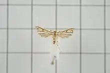 The wingspan is about 17 mm (0.67 in). The forewings are snow-white with a golden brown pattern.