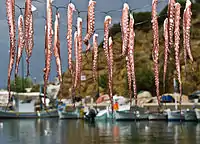 A common scene in the Greek islands is octopuses hanging in the sunlight from a rope, just like laundry from a clothesline. They are often caught by spear fishing close to the shore. The fisherman brings his prey to land and tenderizes the flesh by pounding the carcass against a stone surface. Thus treated, they are hung out to dry, and later will be served grilled, either hot or chilled in a salad. A common preparation technique involves classic Greek spices and seasonings, often including olive oil, garlic cloves, oregano, pepper, and lemon juice.[4] On the whole, octopus is considered a superb meze, especially alongside ouzo.[5]