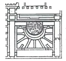 The cavea surrounds the Eastern side of orchestra and had between 300 and 350 spectator seats[3][4] arranged in step-like shape for better visibility. A vaulted structure with numerous vaulted spaces in truncated cone shape supported the cavea. A similar structure was used for the construction of the spectator area of the Colosseum in Rome. The cavea is separated from the skene via parodoi.[2]