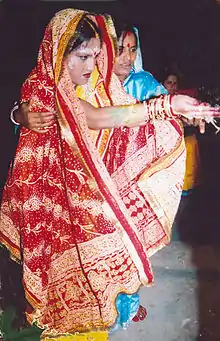 Bahaghara (Odia: ଓଡ଼ିଆ ବାହାଘର, also called as Odia Hindu wedding) is a wedding ceremony performed by Odia Hindu people in the Indian state of Odisha. There are subtle differences in the rites observed by different castes. In Odia marriage rituals, the mother of the bridegroom does not take part in the ceremony. The Utkala Brahmins have their weddings only in the daytime, preferably at midday or in the morning, while the other caste weddings are done during the evening or night. There is the custom of sending betel nuts to family friends for inviting them to the marriage. The first invitation is sent to the family deity as a respect to the lord.[1] Marriages in Odisha are mostly fixed and arranged by the parents. Marriages for serving or capturing is not common.