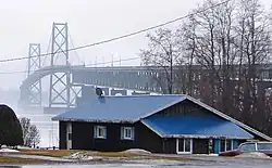The Ogdensburg–Prescott International Bridge (also known as the St. Lawrence Bridge and the Seaway Skyway) is a suspension bridge connecting Ogdensburg, New York in the United States to Johnstown, Ontario (a few kilometres east of Prescott) in Canada. Designed by Modjeski & Masters and completed in 1960, it has six spans and a main span of 350.75 metres (1,150.8 ft) totaling 2.4 kilometres (1.5 mi) across the Saint Lawrence River and Saint Lawrence Seaway.[2] The bridge is owned and operated by the Ogdensburg Bridge and Port Authority, which also owns and operates Ogdensburg International Airport, the Port of Ogdensburg-Marine Terminal Facility, Commerce Park, the Port of Waddington, a medium-heavy industrial park and two short line railroads. The Ogdensburg Bridge and Port Authority is a New York State public-benefit corporation.[3][4]