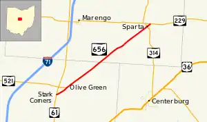 State Route 656 (SR 656) is a state highway in the central portion of the U.S. state of Ohio. The highway's southern terminus is at SR 61 approximately 4.5 miles (7.2 km) north of Sunbury. It travels northeast to its junction with SR 229, less than 0.25 miles (0.40 km) northeast of the village limits of Sparta.