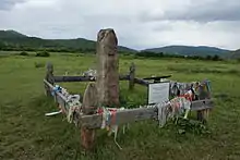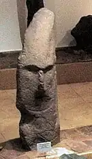 The Okunev culture erected monumental stelae at gravesites.[43][44][45] They were either anthropomorphic or zoomorphic with geometric patterns.[43] Steles often incorporated a human head, bent forward slightly.[43] The steles were often re-used by later cultures. For example the Early Turks (Gökturks) often inscribed them with Old-Turkish runic inscriptions, such as the Orkhon inscriptions or Yenisei inscriptions.[46]