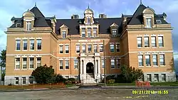 Pittsfield's Old Central High School is located northeast of the city center, on the east side of the old town common. It is a U-shaped 3-1/2 story masonry structure, finished primarily in cream-colored brick, with marble trim and terra cotta detailing. It has a hipped roof pierced by dormers, and is set on a high sandstone foundation. Its centered entrance is flanked by Corinthian columns and topped by a full entablature with balustrade. The interior design echoes the color schemes of the exterior.[2]