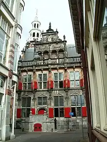 The town hall (built in 1565 and restored and enlarged in 1882) contains a historical picture gallery.[1] The building was considered very large and imposing in its day; just after it was built in 1566 Lodovico Guicciardini referred to The Hague as the most beautiful, richest, and biggest village of Europe. However, The Hague was not a walled town and therefore Guicciardini categorized it with the villages. For a village, the city hall must have seemed quite grand. That The Hague was thus vulnerable to attack makes it all the more amazing that the old city hall survived the Protestant Revolution without damage to older ornaments and windows.