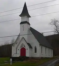 Old Hawleyton Methodist Episcopal Church is a historic Methodist Episcopal church located at Hawleyton in Broome County, New York.[2] It was constructed in 1856-1857 and altered in 1877 and 1942; the attached Fellowship Hall was constructed in two stages between 1950 and 1954. The original structure was built as a small rectangular wood-frame building characterized by a steep gable roof with deeply hanging overhanging eaves in a rural Gothic Revival style.[3]