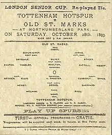 In the same competition, the Saints beat Tottenham Hotspur in the qualifying rounds of 1893-94, by a score of 6-1, in a replay; a match notable for being the first one for which the Spurs issued a programme.[4] However the club lost by a record score of 18-0 to the Old Westminsters at Wembley Park in the first round proper.[5]