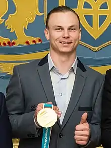 Oleksandr Volodymyrovych Abramenko (Ukrainian: Олександр Володимирович Абраменко; born 4 May 1988) is a Ukrainian Olympic gold medalist freestyle skier, specializing in aerials.[2] He is the 2015–16 Aerials World Cup winner. He competed at the 2006, 2010, 2014 and 2018 Winter Olympics,[3] winning the Olympic gold medal in the men's aerials event at Pyeongchang. Abramenko is also 2019 World Championships and 2022 Winter Olympics silver medalist.[4]