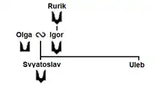 While Olga's birthdate is unknown, it could be as early as 890 AD and as late as 925 AD.[10] According to the Primary Chronicle, Olga was of Varangian (Viking) origin and was born in Pleskov.[11][12] Little is known about her life before her marriage to Prince Igor I of Kiev and the birth of their son, Sviatoslav.[13] According to Alexey Karpov, a specialist in the history of ancient Russia, Olga was no more than 15 years old at the time of her marriage. Igor was the son and heir of Rurik, founder of the Rurik dynasty. After his father's death, Igor was under the guardianship of Oleg, who had consolidated power in the region, conquering neighboring tribes and establishing a capital in Kiev.[14][15] This loose tribal federation became known as Kievan Rus', a territory covering what are now parts of Russia, Ukraine, and Belarus.