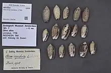 Shell specimens of Oliva oliva at the Naturalis Biodiversity Center, showing variations in color and pattern | |