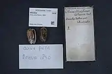- ↑ Reeve L.A. (1850). Détermination des espéces de Mollusques testacés. Ann. Mus. Nat. Paris, vol. 16. World Register of Marine Species, Retrieved 28 April 2010.