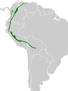 The olive-backed woodcreeper inhabits the middle elevations of the Andes. It is most common in humid evergreen montane forest and very humid cloudforest and extends into elfin forest. It favors the interior of mature primary forest but sometimes occurs at its edge and in mature secondary forest. In elevation it mostly ranges between 1,000 and 2,400 m (3,300 and 7,900 ft) but reaches as high as 2,700 m (8,900 ft) in Colombia and Peru and as low as 400 m (1,300 ft) in Colombia and Bolivia.[4][5][6]