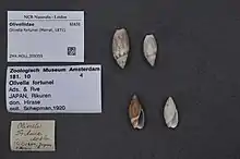 - ↑ Olivella fortunei (Marrat, 1871). Retrieved through: World Register of Marine Species on 28 April 2010.