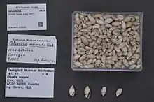 Olivella minuta, common name the minute dwarf olive, is a species of small sea snail, marine gastropod mollusk in the subfamily Olivellinae, in the family Olividae, the olives. Species in the genus Olivella are commonly called dwarf olives.[2]