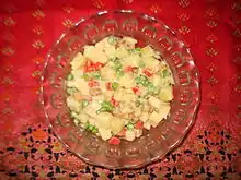 Olivier salad (Persian: الويه) is popular in Iran, where it is known as salad Olivieh and usually made with potatoes, eggs, Persian pickled cucumbers, carrots, chicken, peas and mayonnaise, and is frequently a sandwich filler.[10]