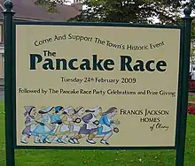 Since 1445, a pancake race has been run in the town on many Pancake Days, the day before the beginning of Lent.[12] Tradition records that in 1445 on Shrove Tuesday, the "Shriving Bell" rang out to signal the start of the Shriving church service. On hearing the bell a local housewife, who had been busy cooking pancakes in anticipation of the beginning of Lent, ran to the church, frying pan still in hand, tossing the pancake to prevent it from burning, and dressed in her kitchen apron and headscarf.[13][14]