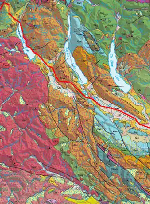 Tabor mapped the SCF turning and merging with the Taneum fault (coincident with the OWL) south of Kachess Lake.[16] This conforms with the general pattern seen in Lakes Keechelus, Kachess, and Cle Elum, and associated geological units and faults (see image, right): each is aligned north—south at the north end, but turns to the southeast where it approaches the OWL.[17] This is suggestive of the OWL being a left lateral (sinistral) strike-slip fault that has distorted and offset the SCF. But that is inconsistent with the SCF itself and most other strike-slip faults associated with the OWL being right lateral (dextral), and incompatible with the geology to the southeast. Particularly, studies of the region to the southeast (in connection with Department of Energy activities at the Hanford Reservation) show no indication of any fault or other structure comparable to the SCF.[18]
