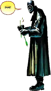 Onomatopoeia is an athlete, martial artist and weapons expert. He invariably carries two semiautomatic handguns, a sniper rifle, and an army knife. He appears to be quite intelligent, having orchestrated the Joker's escape to draw out Batman, as well as avoiding capture by giving the Joker a near-fatal wound, causing Batman to be distracted. His usual outfit consists of black gloves, pants, and shirt, with a long black trench coat and a full, black hood decorated by concentric white circles. In Batman: Cacophony, it is revealed that he collects the masks of heroes he kills, keeping them in a trophy case in his secret identity's house.[9] His marksmanship has been shown to rival even Deadshot's.[10]