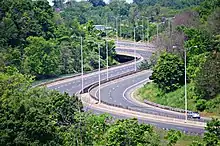 Within St. Catharines, Highway 406 twists frequently, entering the Twelve Mile Creek valley south of a complicated interchange with Westchester Avenue and Geneva Street and curving west. Within the valley, the freeway features a lower design speed and reduced speed limit of 80 km/h (50 mph).[8] It passes beneath the high-level St. Paul Street bridge, crosses the creek and intersects Fourth Avenue. Exiting the creek valley, the freeway parallels Fourth Avenue for a 1 kilometre (0.62 mi), gradually curves to the north and ends 3 km (1.9 mi) to the north, ending at a trumpet interchange with the QEW.[5]