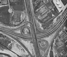 Before plans for the new route were finalized, a flyover was built to provide access from Belfield Road to eastbound Highway 401, opening on October 7, 1968.[9] Because the lands on which the freeway was to be built were occupied, the province elected to apply to expropriate the right-of-way in April 1972.[10] Construction was underway by the end of the year, with the first contracts constructing the trench section near Highway 27. Structures, drainage and grading were completed west of Iron Street to Carlingview Avenue in 1974. In June of that year, contracts were awarded for the same work east of Iron Street to Highway 401. When this was completed in 1975, a paving contract was awarded from Carlingview Avenue to Highway 401.[11]