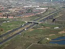 In 1987, construction began south of the future Highway 407 interchange, expanding the two lane Heart Lake Road to a six lane freeway. In addition, work began on the future southbound lanes north of Steeles Avenue.[21][22] In 1990, the Courtney Park Drive overpass was widened from two to four lanes as ramps were added to connect to the freeway south of it. By mid-1991, Highway 410 was complete from north of Highway 401 to Bovaird Drive, and work was underway to complete the junction, with an eleven-span semi-directional flyover ramp from Highway 401 eastbound to Highway 410 northbound, while the flyover ramp from Highway 410 southbound to Highway 401 eastbound replaced the existing loop ramp.[23] The interchange with Highway 401 was expanded alongside the widening of that highway to a collector-express system and opened to traffic ramp-by-ramp beginning August 28, 1990 and continuing through the end of the year.[24]