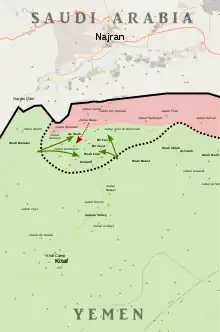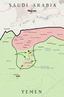 Following the Houthi takeover in Yemen, a border conflict erupted along the Yemeni-Saudi border. Saudi-backed forces attempted to advance into the Houthis' core territories of northern Yemen, while pro-Houthi forces launched incursions into Saudi Arabia.[3][14] Besides the general enmity between the Houthis and Saudi Arabia, the border conflict also takes place amid the still contentious issue where the border should be located in the first place. The southwestern Saudi Arabian province of Najran was traditionally part of Yemen until it was conquered by the former in 1934. Since then, many Yemenis continue to regard Najran as Yemeni territory.[3]