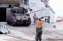 ![]() An M577 command and control vehicle rolls off the Military Sealift Command ship MV Cape Decision | |||||||