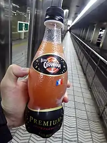 Orangina (French pronunciation: [ɔʁɑ̃ʒina]) is a lightly carbonated beverage made from carbonated water, 12% citrus juice (10% from concentrated orange, 2% from a combination of concentrated lemon, concentrated mandarin, and concentrated grapefruit juices), as well as 2% orange pulp.[1][2] Orangina is sweetened with sugar or high fructose corn syrup (glucose fructose) and in some markets (such as the United Kingdom) with artificial sweetener. Natural flavors are also added.[3]