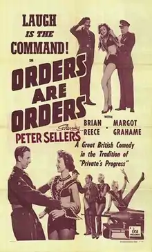 Orders Are Orders is a 1955 British comedy film directed by David Paltenghi, and featuring Brian Reece, Peter Sellers, Sid James, Tony Hancock, Raymond Huntley, and Bill Fraser. Eric Sykes contributed to the script and appears in a minor role.[2] It was a remake of the film Orders Is Orders (1933), itself based on the play Orders Are Orders by Ian Hay and Anthony Armstrong.
