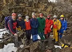 The Oregon High Desert Grotto was first created in 1989 by Dan Best.[7] It lasted only a year before complications terminated the Grotto.[8] In late 1995, the OHDG was reformed by the new founding member Ric Carlson, who was at the time an employee of the United States Forest Service.[9] By 1997, the Grotto had over 30 members, a newsletter publication, and a growing knowledge of caves in the Central Oregon area and beyond.[8] As of 2012, the OHDG continues to find new caves. Grotto member Matt Skeels has found over 100 new caves.[10][11] Today, the Grotto is actively involved with caving in most of Oregon and the adjacent states.[12][13][14][15][16]