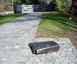 The memorial features a stone bench with wrought iron gating around a cobblestone circle. Scattered bronzes of common objects such as shoes, glasses, and a suitcase represent items left behind by those persecuted during the Holocaust. A cobblestone walkway, with granite bars simulating railroad tracks, leads to a wall containing a history of the Holocaust as well as quotes from survivors.[1][6] The memorial also contains a "soil vault panel", which covers soil and ash from six extermination camps of the Holocaust (Auschwitz-Birkenau, Bełżec, Chelmno, Majdanek, Treblinka, and Sobibor) brought back by local residents.[3][7] Engraved on the back of the wall are the names of people who died in the camps, as well as the names of their surviving relatives in Oregon and Southwest Washington.[1][8] Author and designer John Laursen created the lettering for the memorial.[9] Other design team members included artists Tad Savinar and Paul Sutinen, landscape architects John Warner, Marianne Zarkin and Marlene Salon, and historian Marshall Lee.[10]