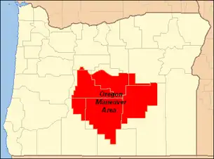 The maneuver extended across parts of seven eastern Oregon counties, a total of over 10,000 square miles (26,000 km2). Almost all of Deschutes County was included in the maneuver area along with large parts of Crook, Harney, Klamath, and Lake counties. Small portions of Jefferson and Grant counties were also included in the maneuver area. The area included parts of four national forests, the Deschutes National Forest in the west, the Fremont National Forest in the southwest, the Ochoco National Forest in the north and the Malheur National Forest in the northeast plus vast tracts of land administered by the Bureau of Land Management throughout the maneuver area. The maneuver area was an irregular triangle shape, with Sisters in the northwest corner, Burns in the northeast corner, and Valley Falls in the south.[1][4][5]