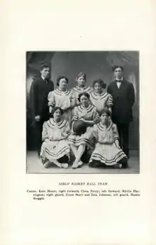 A women's basketball team was established at Oregon Agricultural College during the academic year of 1897–98, with one game played in the spring of 1898 by the school squad in response to a challenge offered by the team of the Chemawa Indian Institute of Salem.[3] The match, played April 29 in Salem at the Willamette University gym, was won by OAC by a score of 13 to 11.[4] The OAC team included Inez Fuller, Fanny Getty, Dora Hodgin, Blanche Holden, Bessie Smith, and Leona "Nonie" Smith.[4]