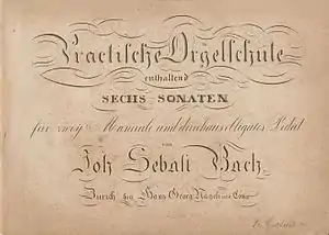 - Bach, J. S. (1815), Nägeli, Hans Georg (ed.), Practische Orgelschule enthaltend Sechs Sonaten, Zürich