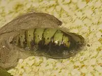 The pupa forms in a crevice (e.g. in tree bark or fence) inside a silk cocoon. It is glossy black and hairy.[6]