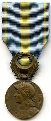 The Orient campaign medal is a 30mm in diameter circular medal struck from bronze. The obverse bears the relief image of the "warrior republic" in the form of the left profile of a helmeted woman's bust, the helmet being adorned by a crown of oak leaves. On either side, the relief inscription along the circumference "FRENCH REPUBLIC" (French: RÉPUBLIQUE FRANÇAISE).[1]