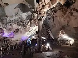 The main sights of the show cave are the Concert Hall, the Big Stalagnate, the Little Chasm and the Golemite Sipei Hall, the largest hall in the cave. Another important landmark is the sinter lake Izvorcheto (the Spring) and its white stalagmites.[1]