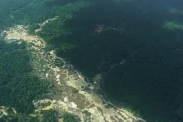 The mining at orogenic gold deposits has significant negative environmental effects. Over 90% of ore extracted from orogenic gold deposits is treated by the process of cyanidation.[53] The toxic waste created from this process is stored in tailings ponds, which presents a risk for contamination of soil and water in the event of accidents or negligence by those handling the toxic liquids.[54] This contamination can occur in many forms such as dam failures, unregulated drainage into rivers,[55] or leeching of toxic liquids through permeable soils.[56] One such example of this type of environmental disaster is the August 19, 1995 Omai cyanide spill in which the tailings dam of the Canadian owned Omai Gold Mines Ltd failed, releasing over 440 000 cubic meters of cyanide-laced effluent into the Omai river, causing over 80 km of distaster zone downriver.[57] The energy consumption associated with operating a mine in an orogenic gold deposit also produces a large carbon footprint, which as a greenhouse gas contributes to climate change.[58] Furthermore, creating space for open pit mines, tailings ponds, and mine infrastructure requires clearing vast amount of land, leading to deforestation and the destruction of natural habitats.[59]