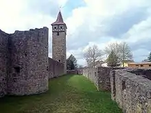 The fortress church is surrounded by two rings of walls and has a rectangular ground plan. The inner area measures 60 by 60 meters and is enclosed by a wall six to eight meters high. At each corner of the wall ring there is a corner tower about 25 meters high. The two eastern towers are round, the two western towers have a rectangular ground plan.[12] The towers are each 66 meters apart.[13] In the middle of the northern boundary wall there is a circular bastion as reinforcement. Around the inner wall runs a 7.5-meter-wide Zwinger.[12] The outer wall is five meters high, has tower-like corner bastions and another bastion on each of the long sides. No longer preserved is a round bastion on the east side of the outer wall.[12] At the southwest corner is a fifth defense tower. A sixth defense tower at the southeast corner of the outer wall has also not survived. Foundations of this tower were found during construction works in 1911. The part of the eastern wall adjoining the tower was also demolished.[12]