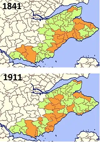 The first census of Scotland which included the recording of surnames at each address was that of 1841.[11] The latest published with names (due to confidentiality policy) is 1911. The occurrence of the Oswald surname at these two census shows that the name was distributed in the south of Fife, especially around Largo Bay from Kirkcaldy to Largo (see map).