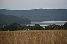 One mountain near the lake is Mount Wellington, which is located on the north end of the lake, east of Hyde Bay.[27] It is known as "The Sleeping Lion", as it looks similar to a lion laying down, viewed from Cooperstown, New York. It was named by George Hyde Clarke in honor of Field Marshal Arthur Wellesley, 1st Duke of Wellington, who went to Eton College in England with Clarke.[28] Red House Hill is located on the west side of the lake, west of Six Mile Point.[29] Mount Ovis is located on the west side of the lake behind the Farmer's Museum. It was named around 1813, by James Fenimore Cooper's grandfather, who kept on it some of the first imported Merino sheep (Ovis aries).[30] Mount Vision is located on the east side of the lake by the south end.[12] Mount Vision was named by Judge Cooper, and is the location where his father first saw the lake.[12][30]