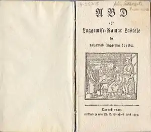 In 1795, Masing compiled and published a children's textbook for learning reading, the ABD. (The letter 'C' does not appear in Estonian words, and back then, was not considered part of the Estonian alphabet. This considered, the title could be translated as "ABC.") He published a further textbook with methodical reading instructions, the Luggemislehhed, in 1821.