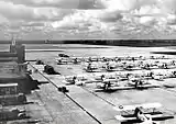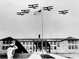 Ottumwa Naval Air Station (NAS Ottumwa) was constructed as a Naval Training Center shortly after America's entry into World War II. The Navy, faced with providing aviators and support personnel for a two-front war, began a massive campaign of rapid expansion. On April 15, 1942, the U.S. Navy Site Selection Board met with Ottumwa city officials and determined a 1,400-acre tract of land a few miles north of the city would be a suitable location for a primary flight training facility. Based on their recommendation, Navy Secretary Frank Knox approved the location on July 9, 1942, and on August 6, 1942, groundbreaking for the base was held.[4] The first group of Naval Aviation Cadets arrived at the base on March 10, 1943, and flight training officially began four days later. Another first for NAS Ottumwa occurred on May 30, 1943, when the first group of U.S. Navy WAVES arrived.[4] At its peak, NAS Ottumwa was averaging one thousand flight hours per day, and over 600,000 flight hours logged by the time the base was closed.[5] Aircraft used in flight training were mostly the SNJ, the N3N Canary, and the N2S Kaydet. Around sixty buildings—hangars, control tower, barracks, classrooms and sundry others—were built for the Navy's use. The base avenues were named for U.S. Navy aircraft carriers that served early in World War II: Enterprise, Hornet, Langley, Lexington, Wasp and Yorktown. Streets were named for U.S. Navy Admirals Dewey, Farragut, Moffett, and Sims along with Marine Corps General Smedley Butler and American Revolutionary War naval hero John Paul Jones.[6]