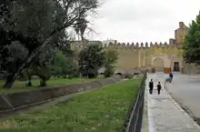 The Oued Fejjalin is one of the most important divisions. It passes through the north part of the Jnan Sbil Gardens and through the Dar al-Beida Palace, before splitting into more branches. One branch goes south but has mostly disappeared today. The other, the Oued el-Lemtiyyin, continues northeastwards toward the Bou Jeloud area and supplied the northern parts of the city.[4][1] Just after it enters the city walls, the water of the Oued el-Lemtiyyin is collected by a large distributor structure located adjacent to the south side of Bab Bou Jeloud gate.[7][6] The structure is made of brick and rammed earth. It originally dates from the Almoravid period,[3] although the wall on its west side is part of the Almohad city walls and some hydraulic features likely underwent modifications over the years as the city developed or the agreements regulating water distribution changed.[7] It has three arched openings that lead into vaulted chambers under the wall from which the water then emerges on the other side into three open-air channels or "zones", located at different elevations. The middle zone consists of a large reservoir that feeds water into three underground canals on its eastern side. The two other zones, located on higher ground on either side of this, received lesser amounts of water but were more complex, consisting of multiple small basins and channels that regulated the distribution into local neighbourhoods. The differences in the depth and elevation of the different reservoirs and channels reflected the institutionalized water agreements under which certain neighbourhoods or buildings had priority access to water, while other sites, with less priority, only received it when the water level was high enough to reach the channels and reservoirs located at higher elevations. The water entering into the distributor was also slowed and diverted by small dams and settling basins, as well as by the various reservoirs themselves, which thus also served as a rudimentary water treatment system by catching and filtering garbage and other physical pollution. From this distributor, the water then spread through various underground canals across the neighbourhoods located downstream, starting with those in the Tala'a Kebira and Tala'a Seghira areas. One of the canals still passes through courtyard of the Bou Inania Madrasa today. Other distributor structures, of smaller size and complexity, were located throughout this network and other networks in order to further regulate water distribution.[7][4]