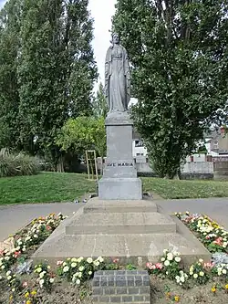 There has been a statue of the Virgin Mary present within the grounds of the present-park since at least the early twentieth century,[1] as James Joyce, in his 1916 novel A Portrait of the Artist as a Young Man, recounts how the character of Stephen Dedalus turned his gaze "towards the faded blue shrine of the Blessed Virgin" before crossing the bridge over the River Tolka.[1] It is possible that the statue had been erected by the inhabitants of Tolka Cottages as a protection against flooding.[2] The present statue, a freestanding 'cast-stone' depiction of Mary (credited to 'Leo Broe & Sons, 94 Harold's Cross Rd'),[1] was presumably erected in 1954 for the Marian Year, an event which mobilised many working-class communities across Dublin to erect statues of Our Lady.[1] As a result, the statue has been dated by the National Inventory of Architectural Heritage to between 1950 and 1955.[1] In the 1960s, amateur Dublin film-maker Leslie Crowe captured footage of the annual procession held around the park to commemorate the statue's vigil.[8]