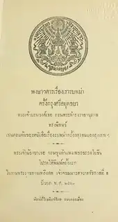 The book was first published in two volumes: The first, covering the Ayutthaya period, was first published in 1917 as a cremation volume, comprising volume 6 of the Prachum Phongsawadan series of topical histories. A revised edition was published in 1920, along with the second volume covering the Thonburi and Bangkok periods, also as cremation volumes; they were titled Phongsawadan Rueang Rao Rop Phama (พงษาวดารเรื่องเรารบพม่า 'A history of our fights against the Burmese'). A further revision was published in two volumes in 1932 as Phongsawadan Rueang Thai Rop Phama (พงศาวดารเรื่องไทยรบพม่า 'A history of the Thai fighting the Burmese'), and has formed the definitive edition for subsequent printings in 1951, 1958, 1962, 1963, 1964, 1971 and later, with the title usually shortened to Thai Rop Phama.[3][1]