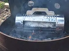 Backwood cooking is a method of cooking without the use of kitchen implements.[4] It commonly takes place in the backwoods, often in combination with wild or conventional camping. Some variants of backwoods cooking allow the use of items of cookware such as a cooking pot;[5] however there are many recipes without any. Some backwoods alternatives to cookware include aluminium foil,[4] fruit skins,[6] and heated stones.[7] Traditionally backwoods cooking takes place over a wood-burning fire because wood is the most available fuel source in the backwoods.[8] As a result, some recipes include information about the intensity of the fire to be used.[6]