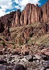 The Owyhee River is a tributary of the Snake River located in northern Nevada, southwestern Idaho and southeastern Oregon in the United States. It is 280 miles (450 km) long.[2][4] The river's drainage basin is 11,049 square miles (28,620 km2) in area, one of the largest subbasins of the Columbia Basin.[5] The mean annual discharge is 995 cubic feet per second (28.2 m3/s), with a maximum of 50,000 cu ft/s (1,400 m3/s) recorded in 1993 and a minimum of 42 cu ft/s (1.2 m3/s) in 1954.[6]
