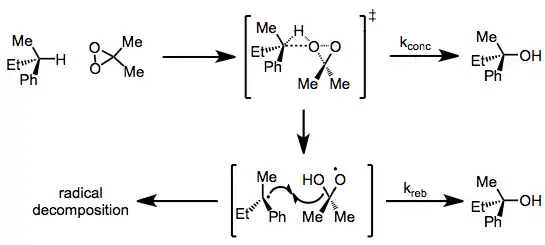 Concerning the mechanism of C-H and Si-H oxidations, two mechanisms have been proposed. The debate centers on whether the oxidation takes place via concerted oxenoid-type insertion or via radical intermediates. A large body of evidence (including analogous oxidations of alkenes and peracid epoxidation) supports the concerted mechanism;[6] however, recent observations of radical reactivity have been made. Complete retention of configuration in oxidations of chiral alkanes rules out the involvement of free, uncaged radicals. However, products of radical decomposition pathways have been observed in some DMD oxidations, suggesting radical intermediates.[7]
